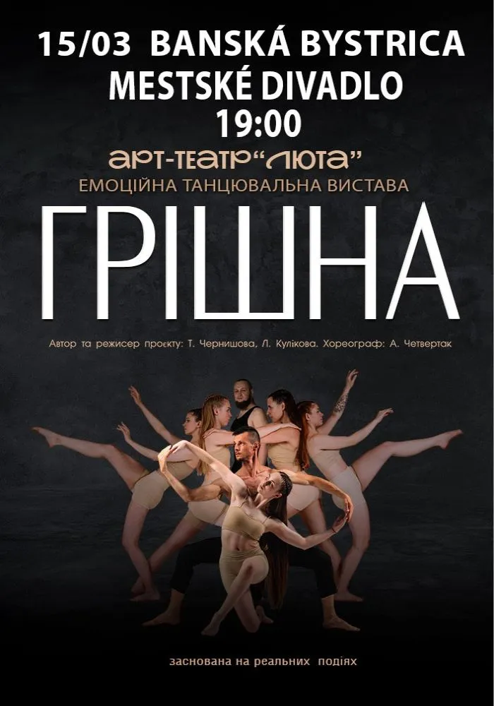 Танцювальна вистава «Грішна» від Арт-Театр «Люта» -це стильна, сучасна і приголомшливо відверта вистава про помилки та каяття, про торги із власною совістю, боротьбу з людським осудом та тонку межу між безчестям та власним щастям. Про грішну любов і одвічне питання «чи насправді краще двоє щасливих ніж троє нещасних?».